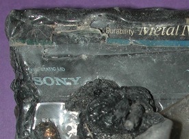 Recovery of fire damaged tapes usually requires breaking open the cassettes replacing both reels with new ones and transferring the unmelted portions of the tape. We have restored numerous tapes that were mere blobs of plastic. The tape cassette often melts over the reels and the enclosed tape thus providing some protection.